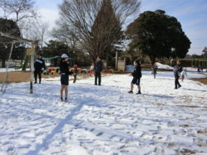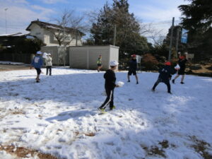 昼休みになると、子どもたちは待ちきれない様子で校庭へ飛び出し、雪遊びを楽しみました。雪だるまを作ったり、友達と雪合戦をしたりと、寒さに負けず元気いっぱいに過ごしていました。